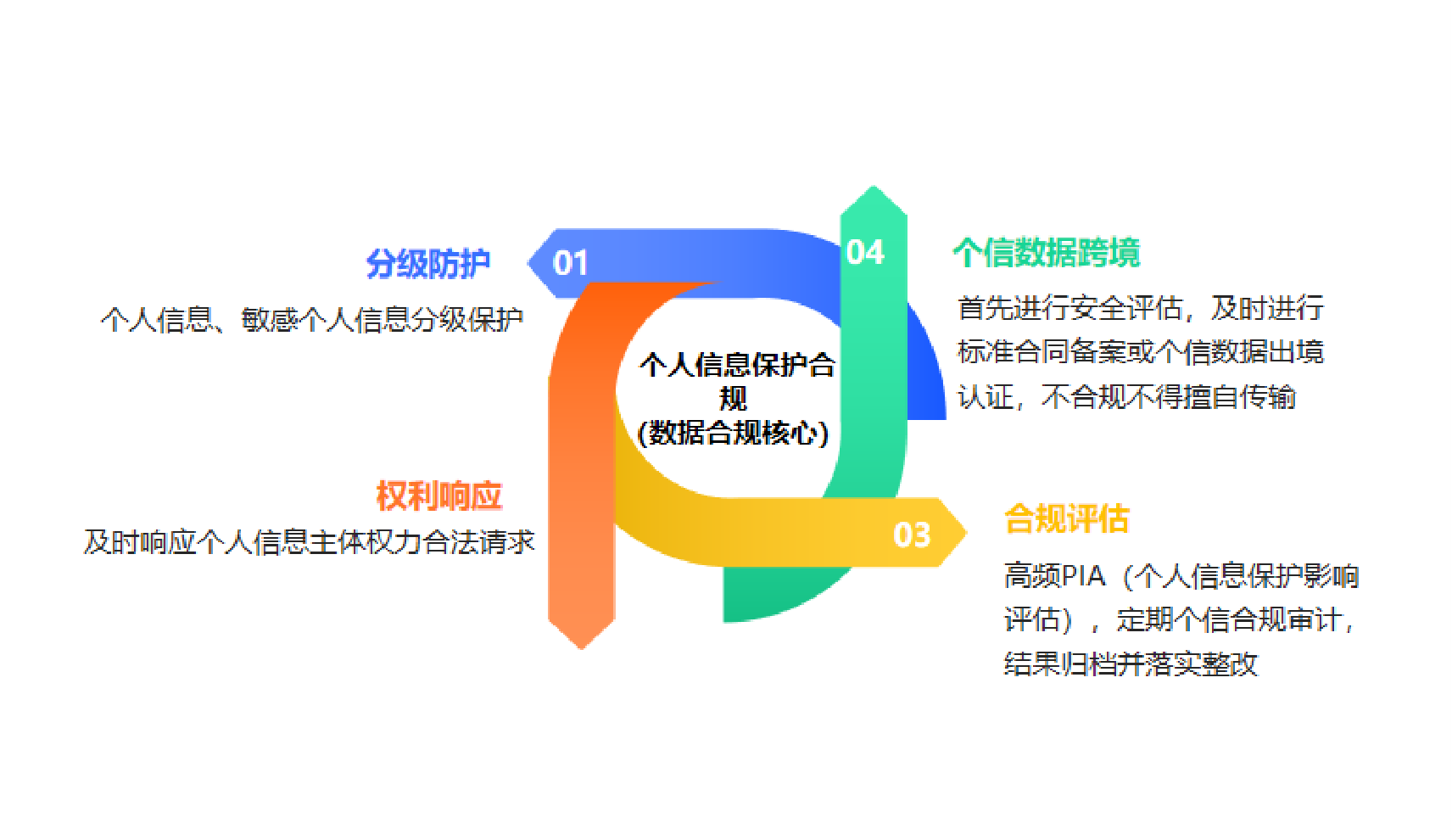 合规评估:高频PIA(个人信息保护影响评估),定期个信合规审计,结果归档并落实整改;