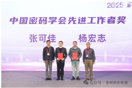 近日,2025第十八届中国密码学会年会 (ChinaCrypt 2025)在天津成功举办。大会上,深圳市网安计算机安全检测技术有限公司(以下简称“网安检测公司”)总工程师杨宏志博士凭借其在参与中国密码学会密评联委会工作中做出的突出成绩,荣膺“2023-2024年度中国密码学会先进工作者奖”。